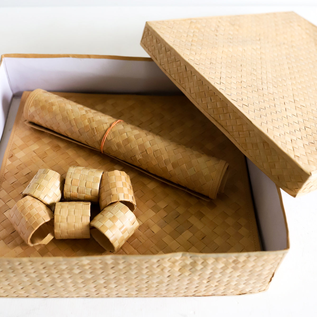 Palmyrah runner table mats with napkin rings are elegant, eco-friendly decor made from natural Palmyra fibres. Their textured design adds a touch of sophistication to any table setting, while the matching napkin rings complete the look for a cohesive and stylish dining experience.