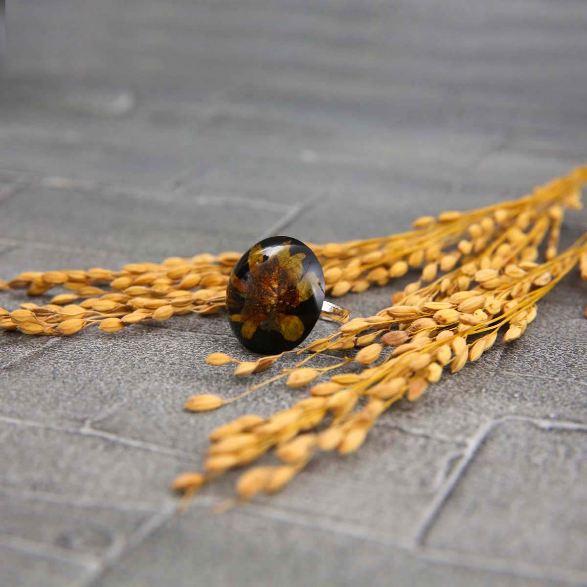 Resin jewellery is an acrylic based stone made out of pigmented resin, preserved pressed natural flowers, stems and leaves.